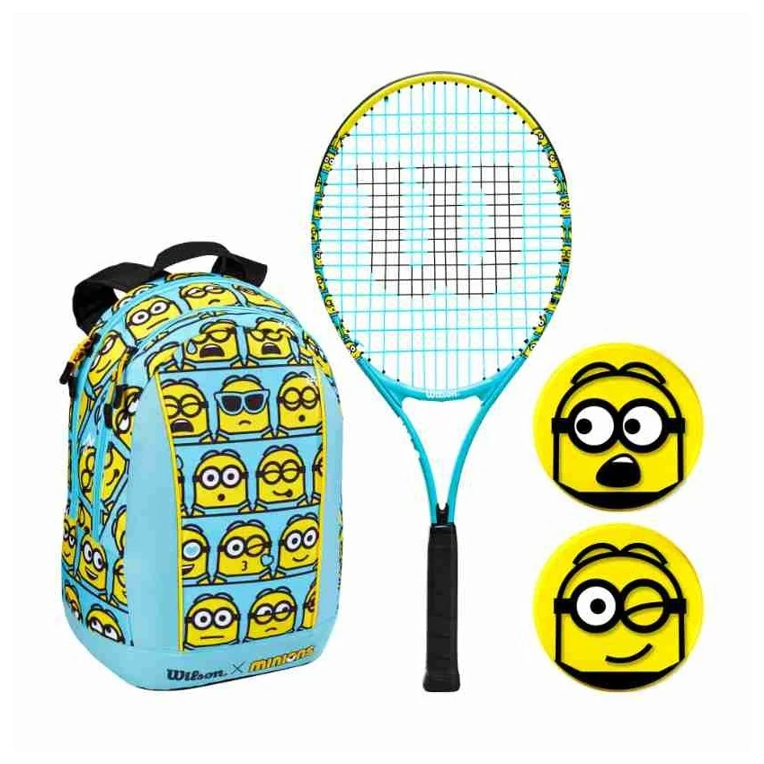Pack junior Wilson Minions 2.0 que incluye raqueta Minions 2.0 talla 25 recomendada para niños de entre 8-9 años, mochila para su transporte y antivibradores Minions 2.0
